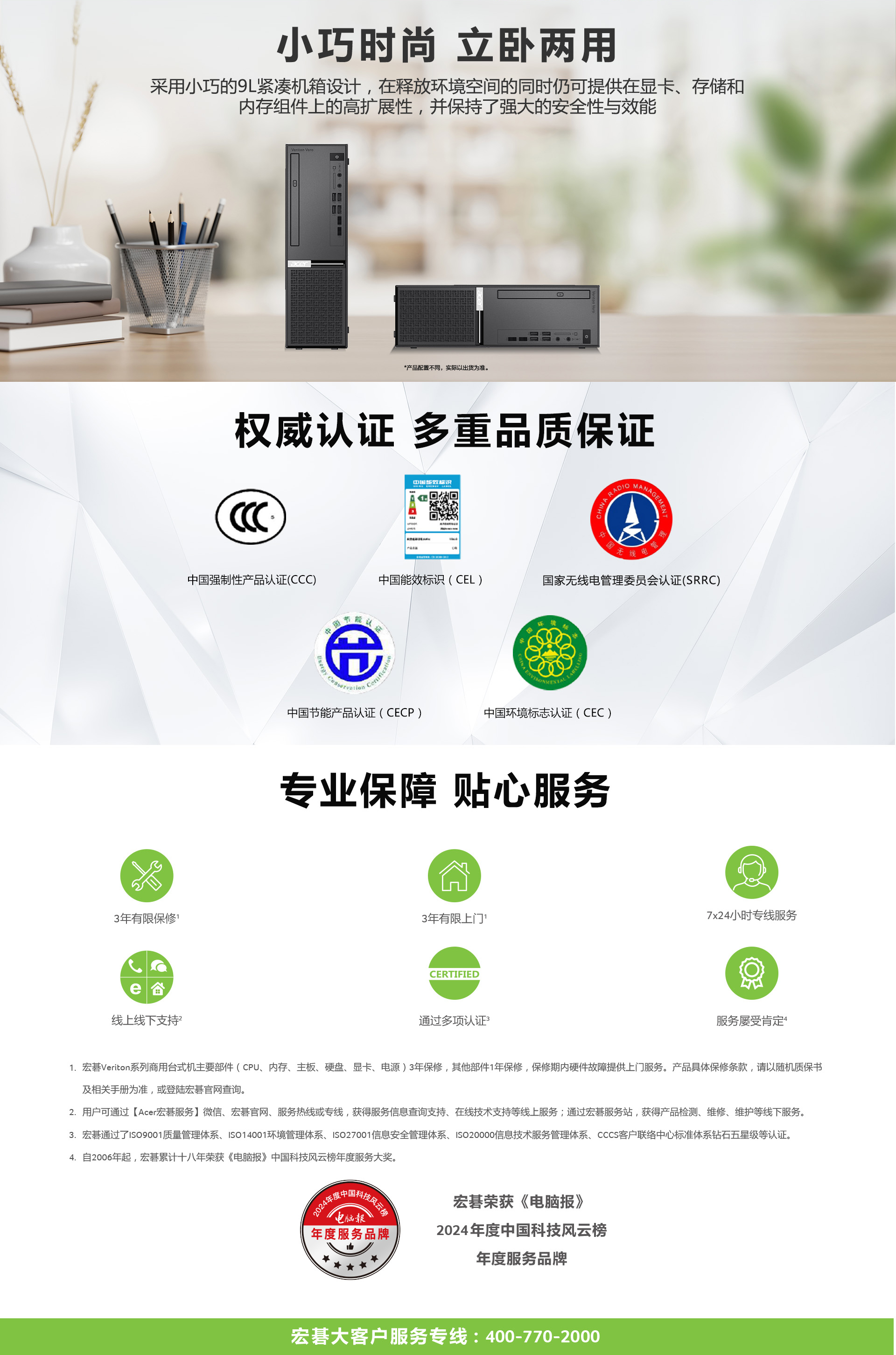 宏基Veriton B650,采用小巧的9L紧凑环保机箱设计,在释放环境空间的同时提供在显卡、存储和内存组件上的高扩展性,并保持了强大的安全性与效能。支持最新第13代英特尔®酷睿™ 处理器和B760芯片组,主板100%全固态电容,拥有10个USB接口和丰富PCI/PCIE扩展槽,可选M.2WI-FI网卡和蓝牙组件,适用于各种商务场景,提供高效超凡的性能表现。