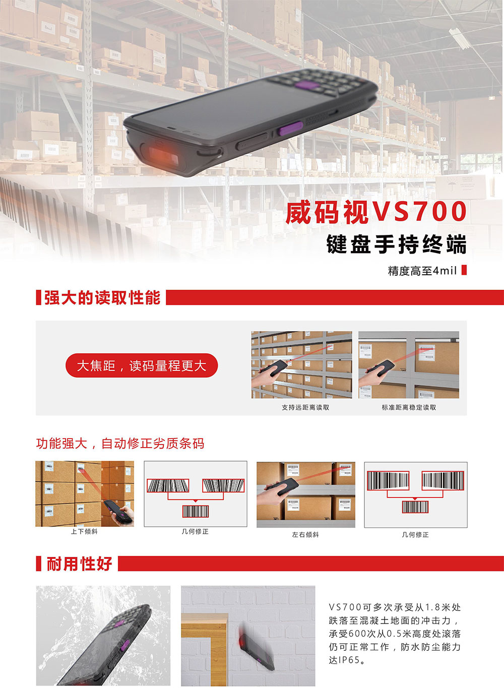 VS700可多次承受从1.8米处跌落至混凝土地面的冲击力,承受600次从0.5米高度处滚落仍可正常工作,防水防尘能力达IP65。